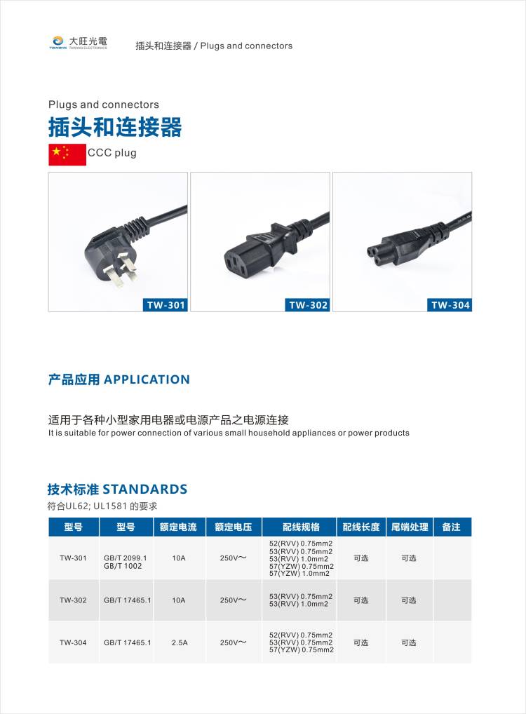 導體采用多股精細軟銅絲絞合。TAWANG的國標三插電源線具有耐寒、耐高溫、接觸性好,性價比高等優點。TAWANG的國標三插頭電源線安全可靠、質量保障!TAWANG歡迎您的谘詢~